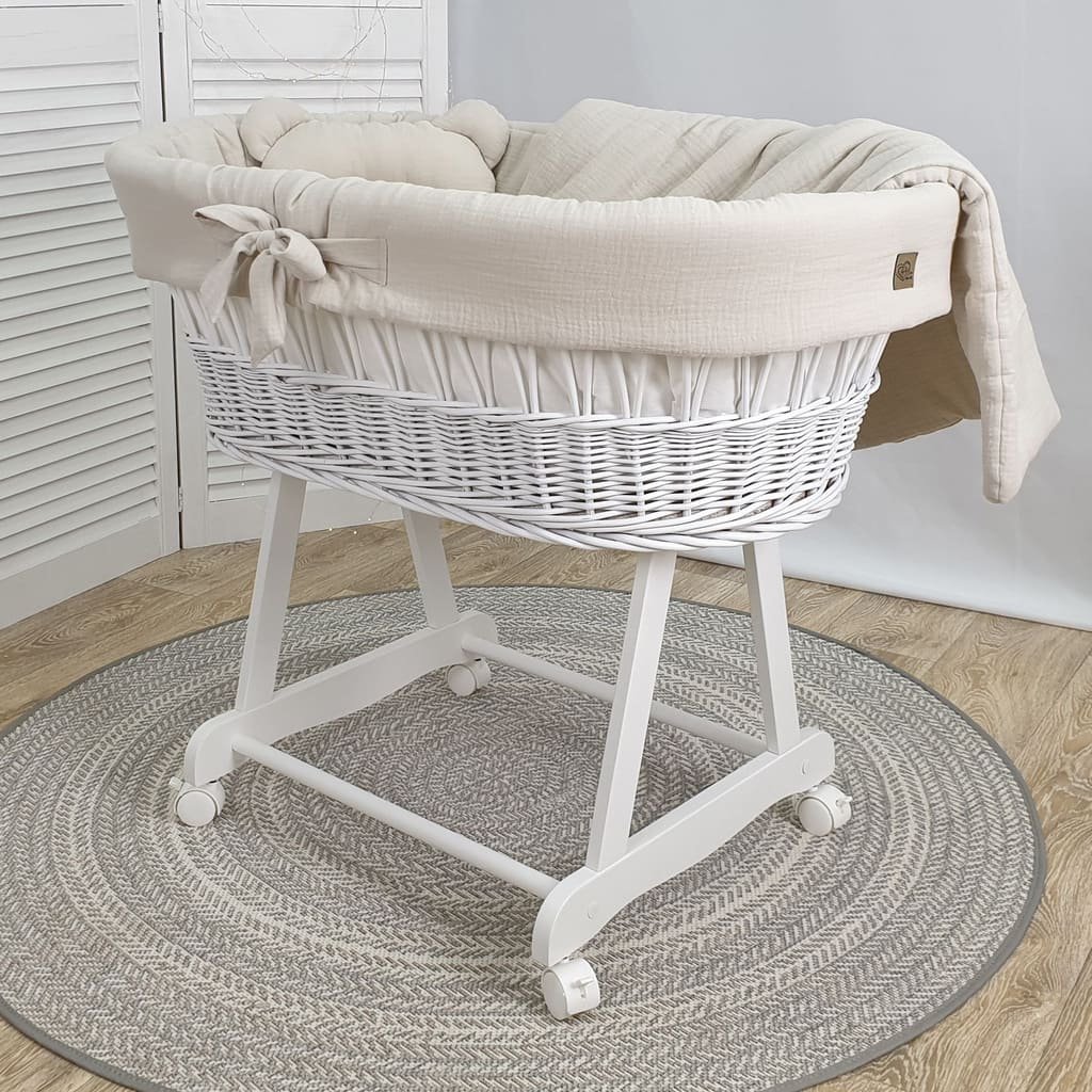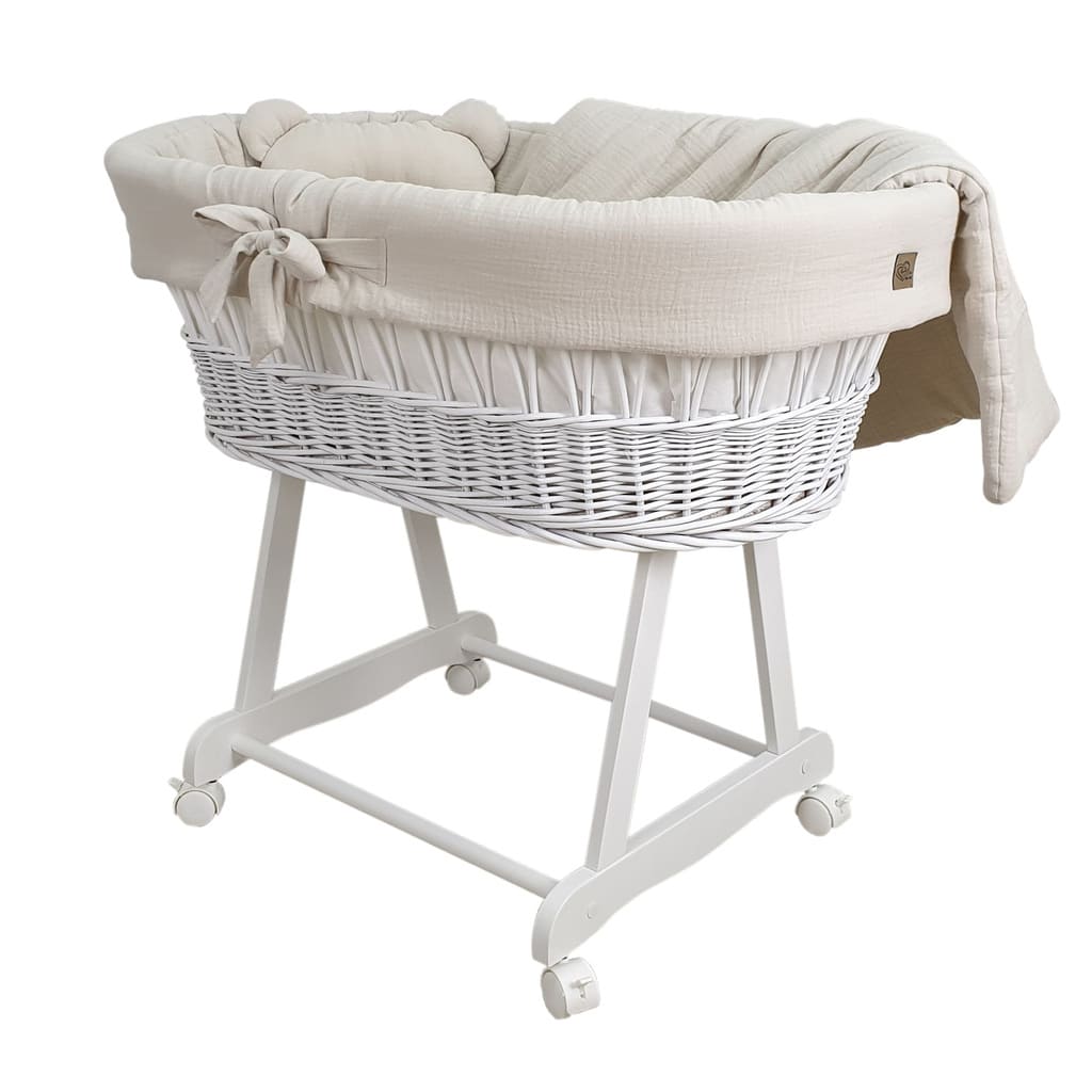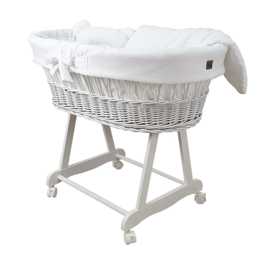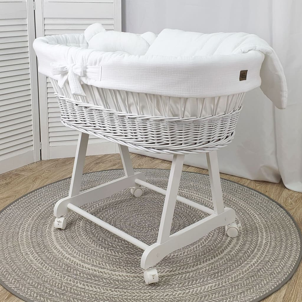 Kosz Mojżesza biały muślinowy na kólkach, zestaw dla niemowląt z pościelą