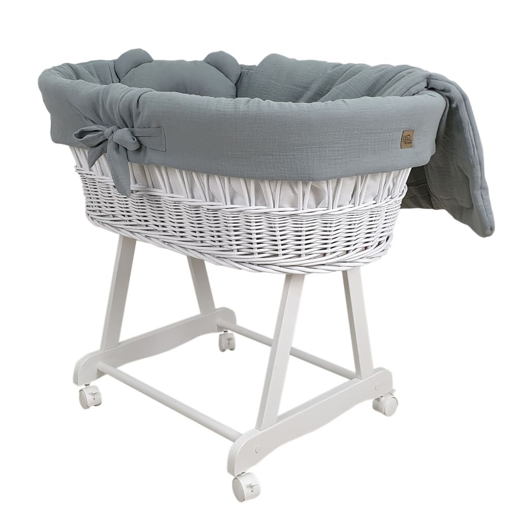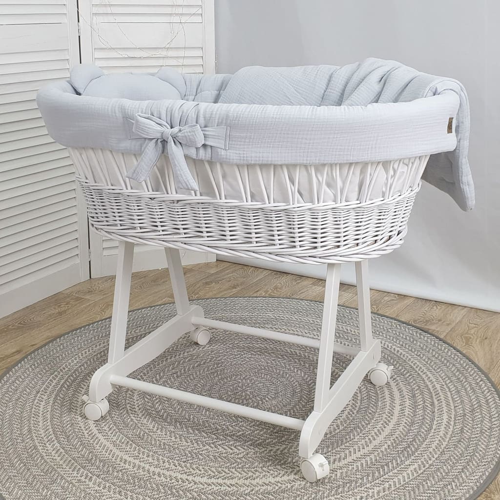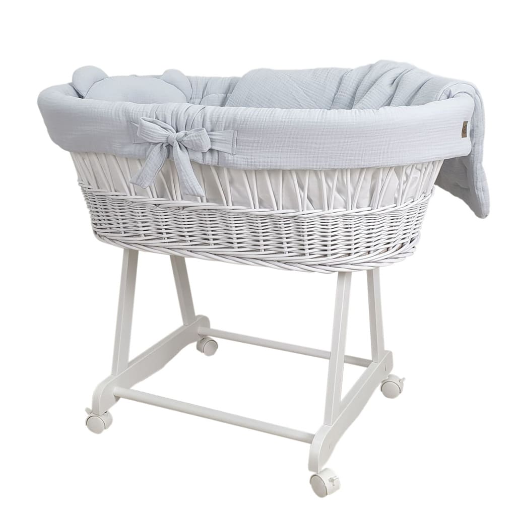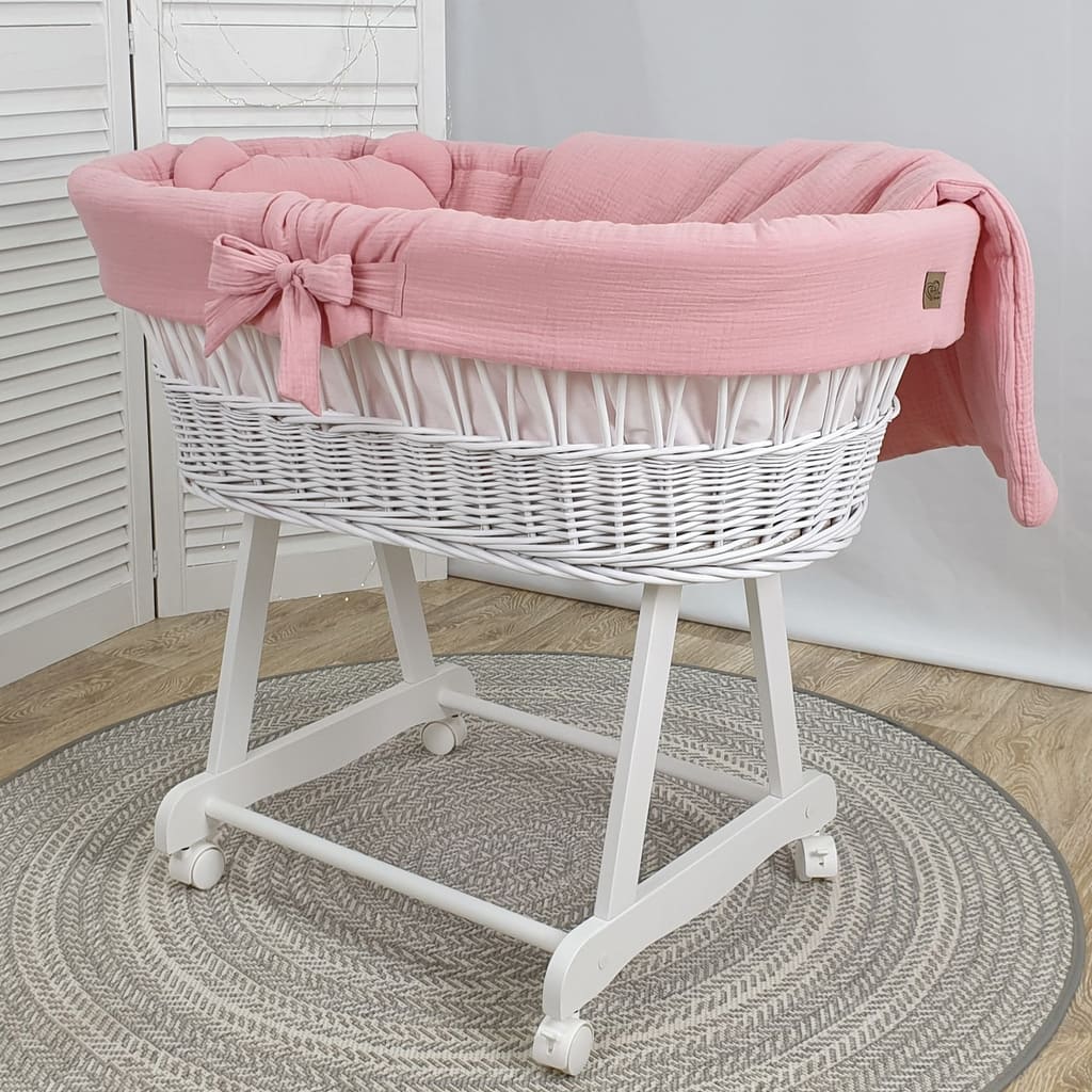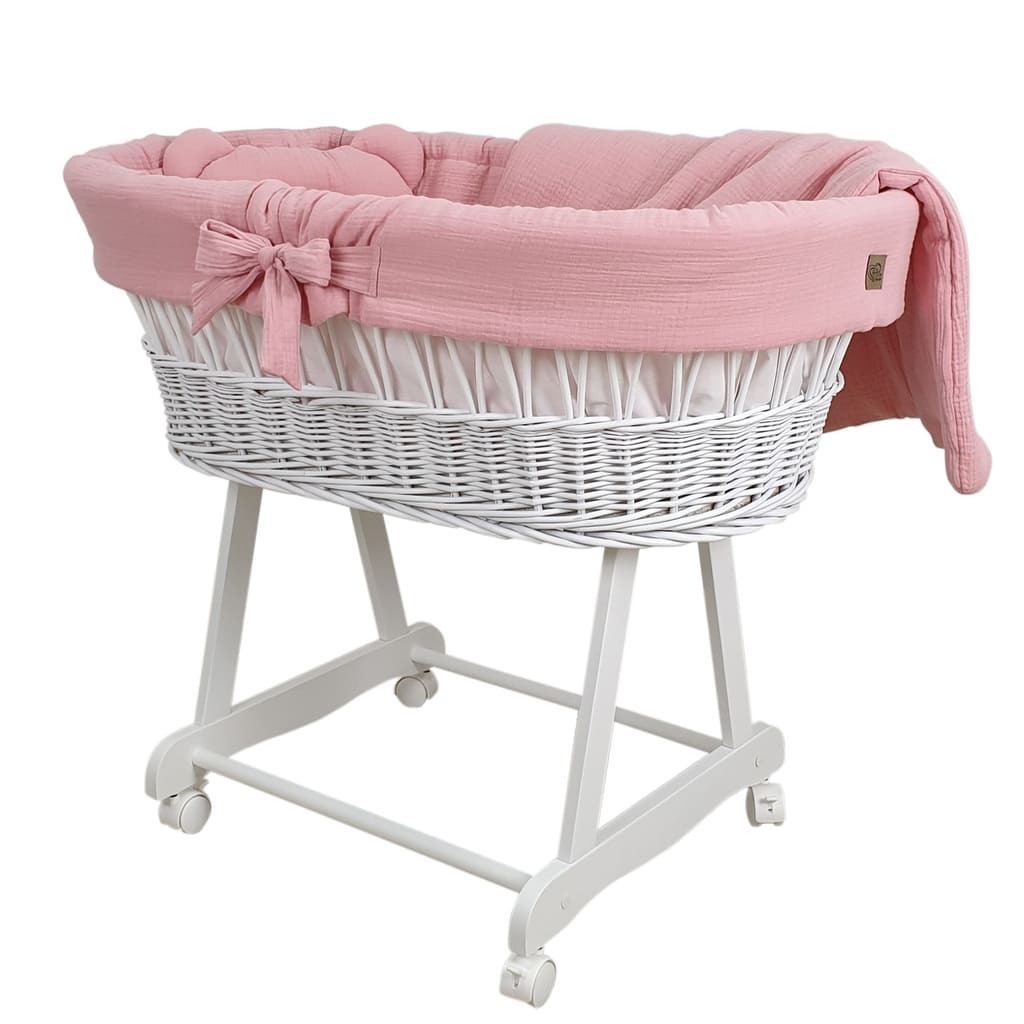 Kosz Mojżesza biały muślinowy na kólkach, zestaw dla niemowląt z pościelą