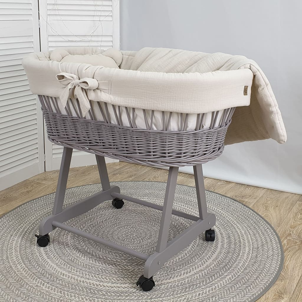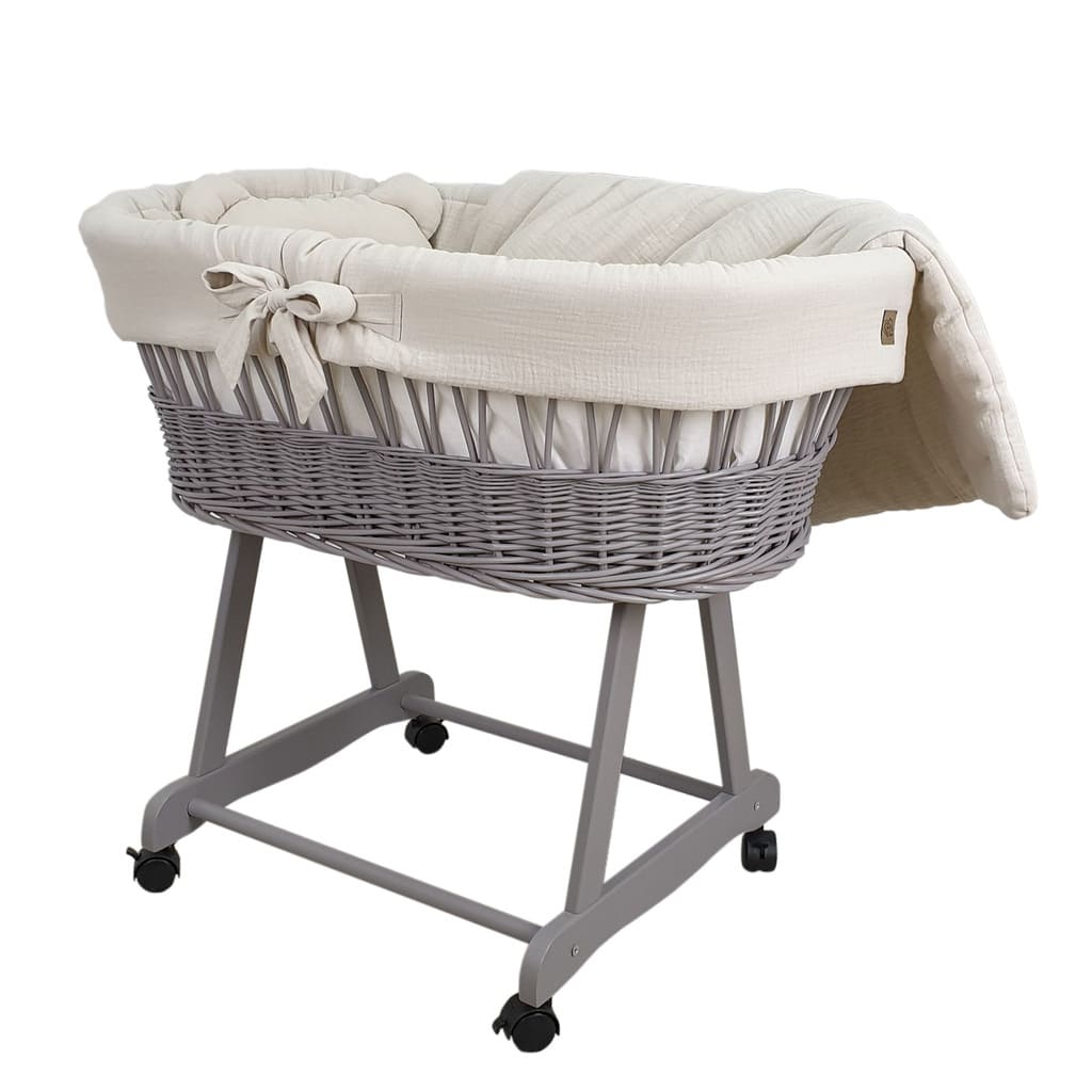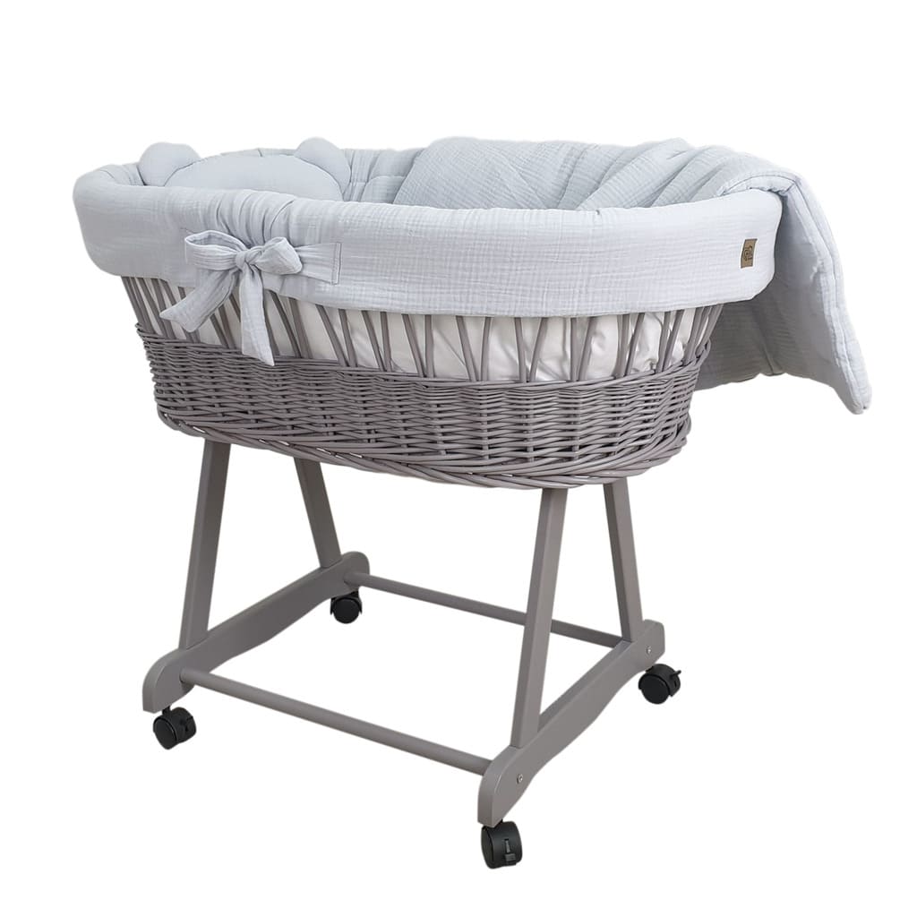 Kosz Mojżesza szary muślinowy na kólkach, zestaw dla niemowląt z pościelą