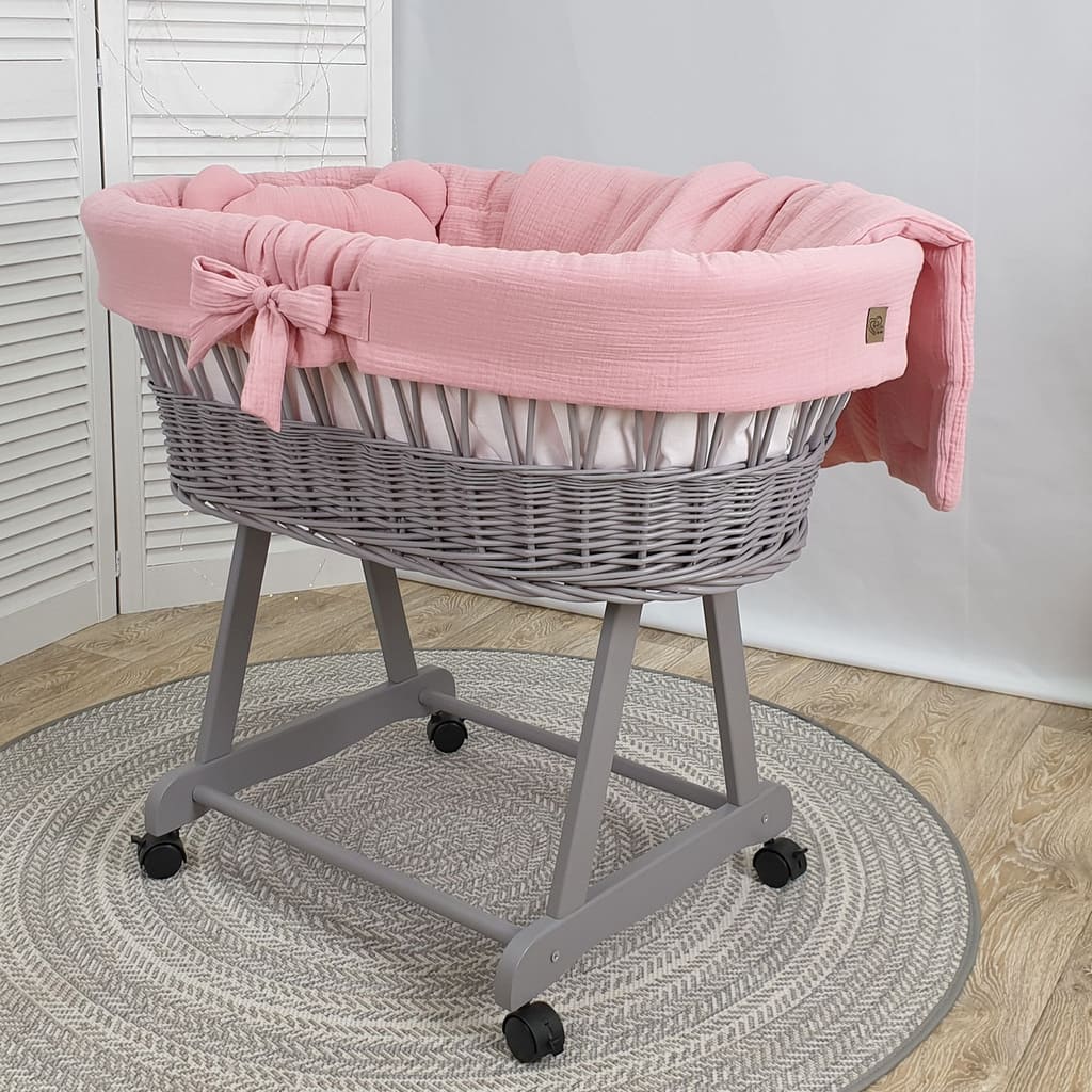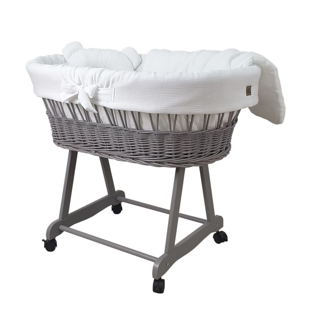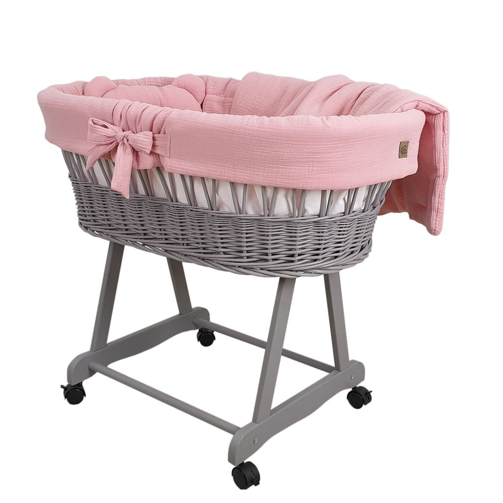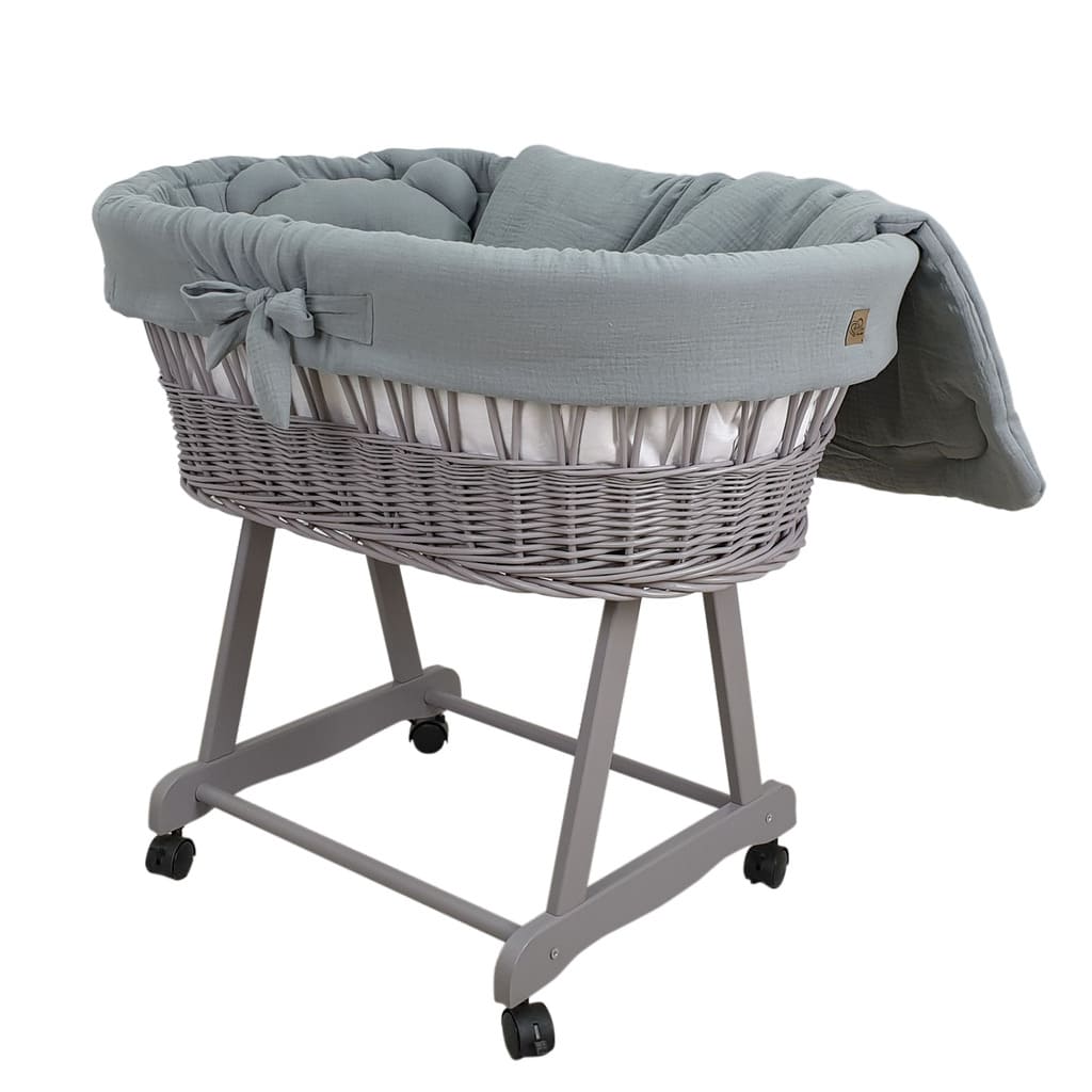 Kosz Mojżesza szary muślinowy na kólkach, zestaw dla niemowląt z pościelą